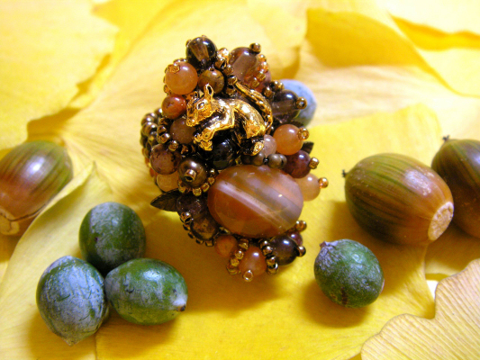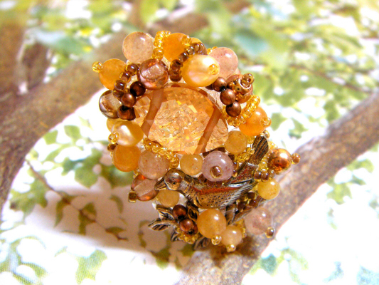 今回は・・・ 暖かい色の スワロフスキーを 中心に作ってみました 木々の間から降り注ぐ キラキラしたお日様 ポカポカな日差しで のんびり過ごす小鳥 そんなイメージです スワロフスキーや透明感のある石を 中心にリングを作るときは、 後ろの土台を透明色で編むように しています・・・ お日様に透かしてみると なかなかおもしろいですよ