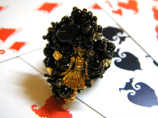 大好きな「アリス」チャーム いつもはカワイイ感じに・・・ でも今回は・・・ ブラックにしてみました。 裏アリス・・・みたいな感じです(←?) しかも、写真でアップになると、顔が怖い カワイイやキレイなデザインばかりを作っていると 怖い系を作りたい衝動に駆られます。 ドクロ・蜘蛛・トカゲなど 待機中 たまに作っていきたいです